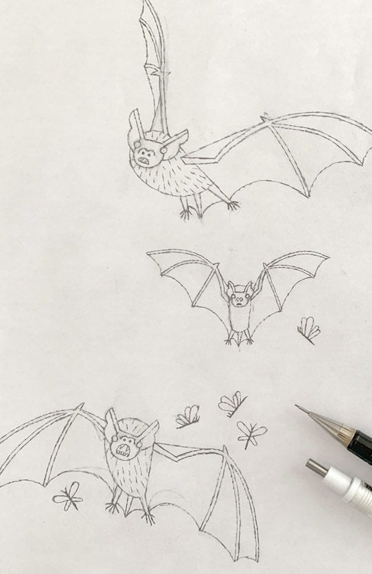 Lorsque Natalie Vock-Verley, l’éditrice des éditions du ricochet, a vu mes crayonnés de chauve-souris pour le livre La p’tite nuit, elle m’a suggéré de les rendre mignonnes et attachantes. Je les réhabilite bien volontiers.